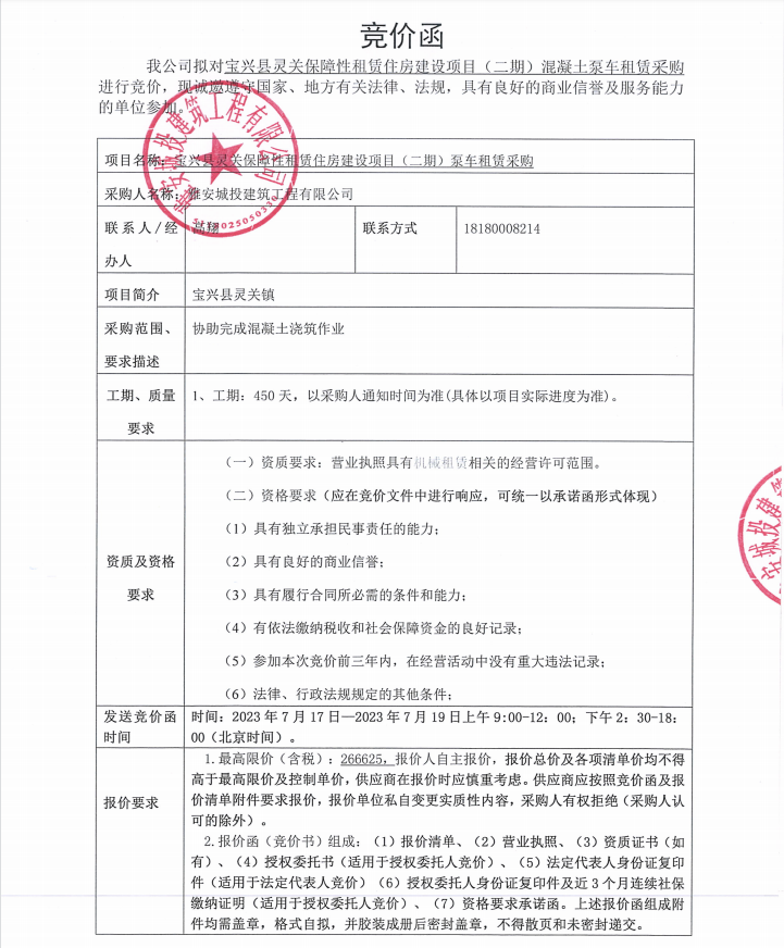 寶興縣靈關(guān)保障性租賃住房建設(shè)項(xiàng)目(二期)混凝土泵車租賃采購競價(jià)公告