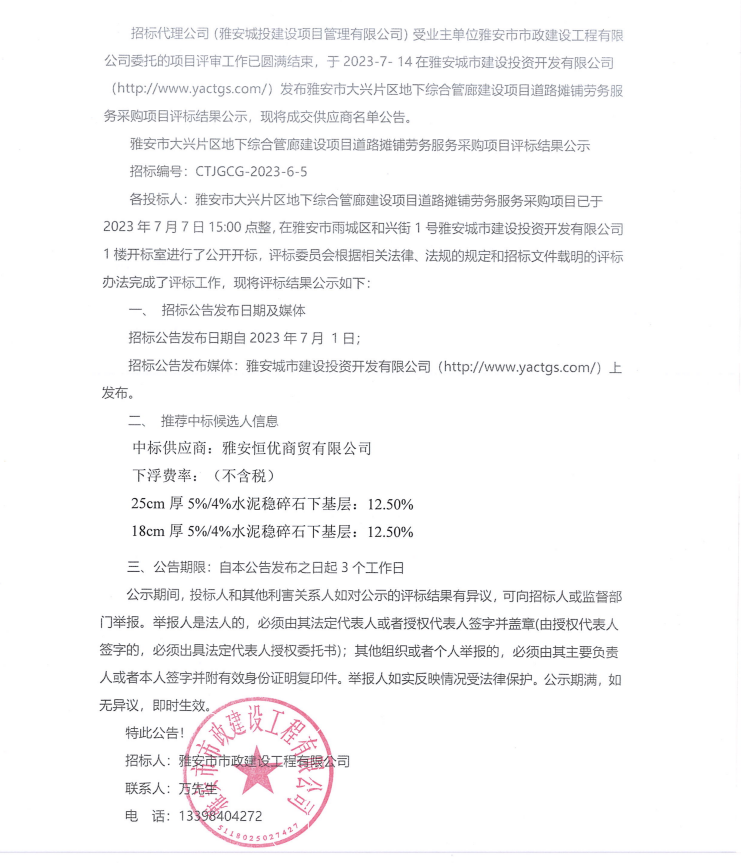 雅安市大興片區(qū)地下綜合管廊建設項目道路攤鋪勞務服務采購項目評標結果公示