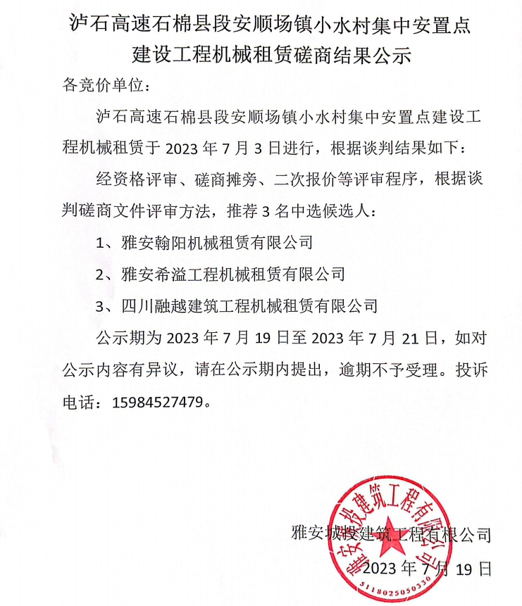 瀘石高速石棉縣段安順場鎮(zhèn)小水村集中安置點建設(shè)工程機械租賃談判磋商結(jié)果公示