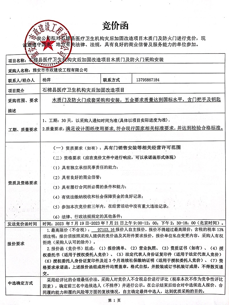 石棉縣醫(yī)療衛(wèi)生機構災后加固改造項目木質門及防火門采購安裝競價公告