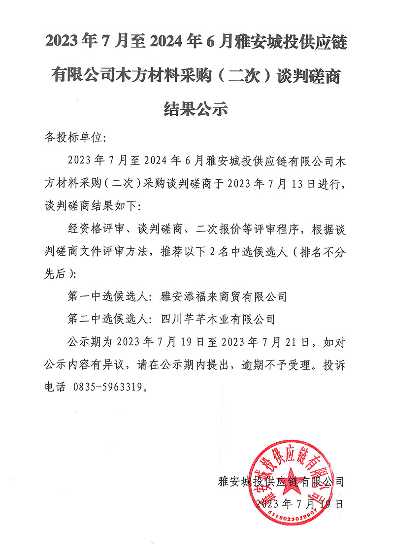 2023年7月至2024年6月雅安城投供應鏈有限公司木方材料采購(二次)談判磋商結果公示
