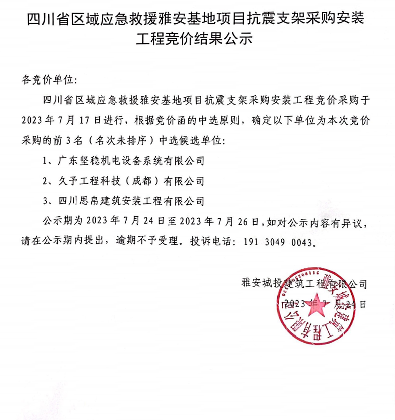 四川省區(qū)域應(yīng)急救援雅安基地項目抗震支架采購安裝工程競價結(jié)果公示