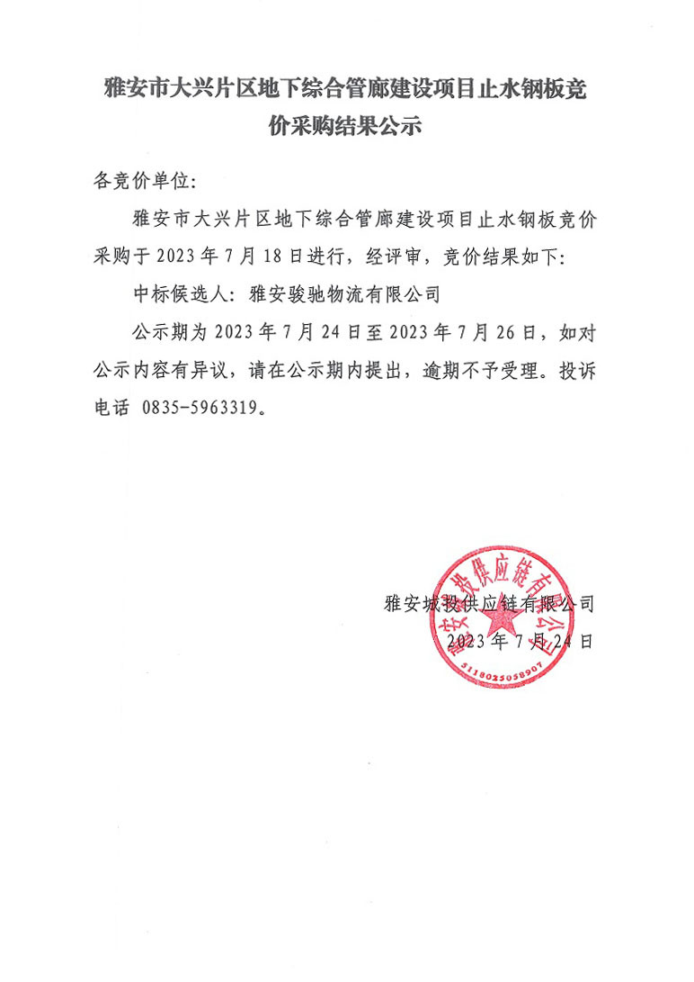 雅安市大興片區(qū)地下綜合管廊建設(shè)項(xiàng)目止水鋼板競(jìng)價(jià)采購(gòu)結(jié)果公示