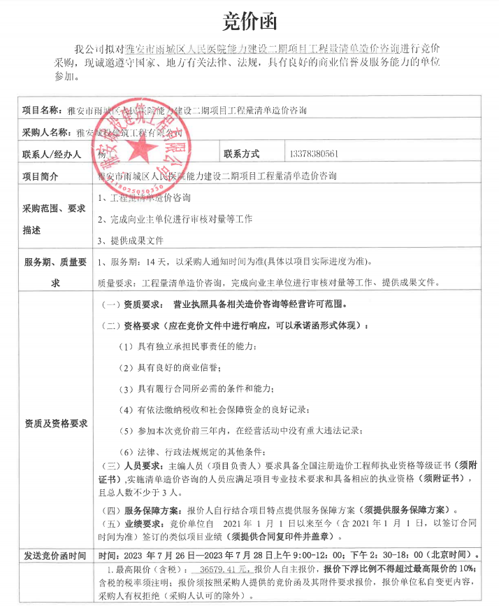 雅安市雨城區(qū)人民醫(yī)院能力建設(shè)二期項(xiàng)目工程量清單造價(jià)咨詢競(jìng)價(jià)公告