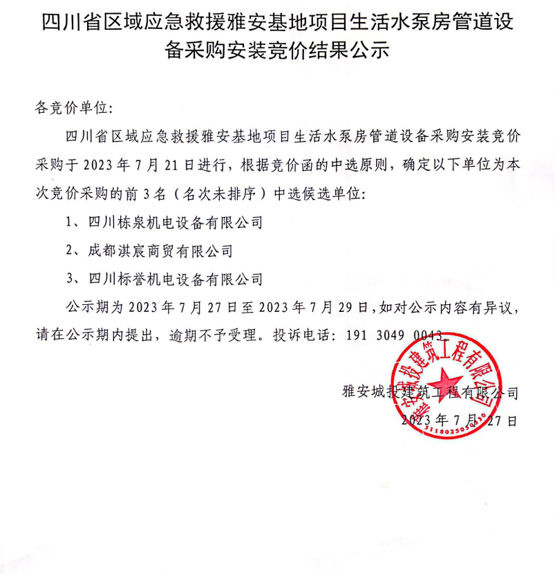 四川省區(qū)域應急救援雅安基地項目生活水泵房管道設備采購安裝競價結果公示