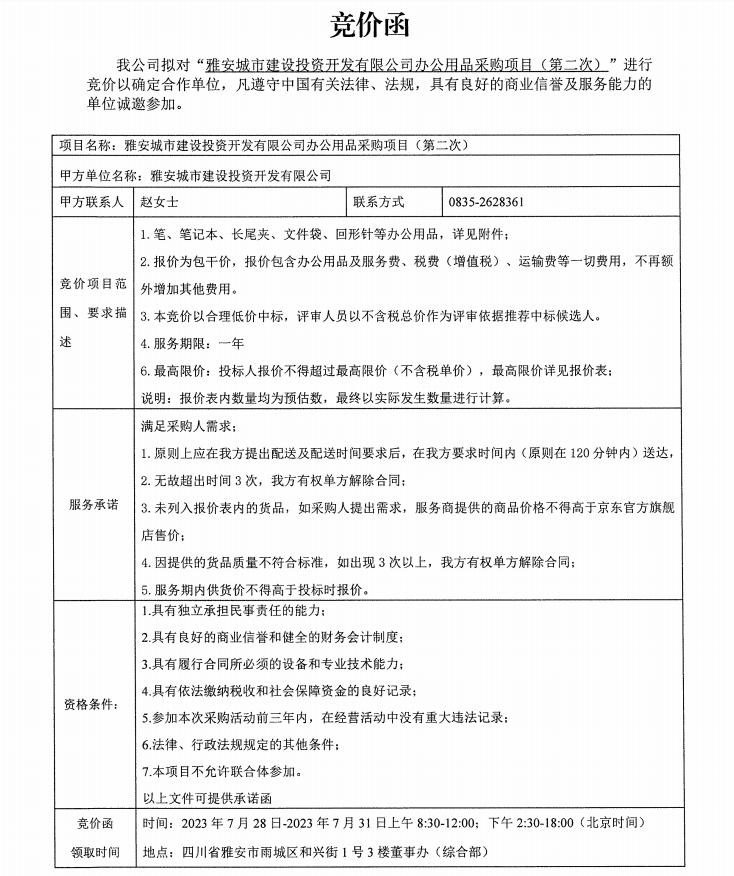 雅安城市建設(shè)投資開(kāi)發(fā)有限公司辦公用品采購(gòu)項(xiàng)目(第二次)競(jìng)價(jià)公告