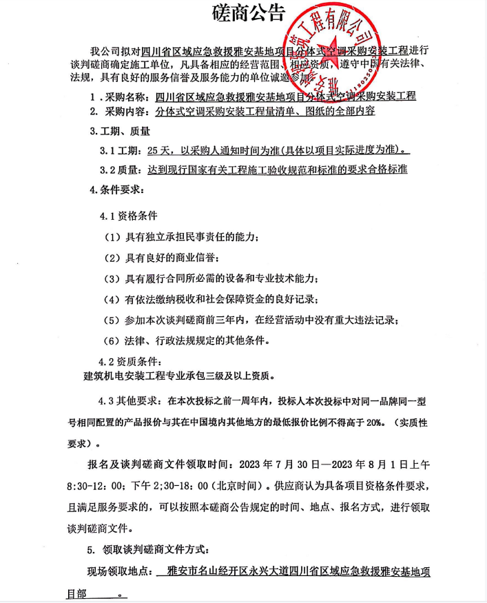 四川省區(qū)域應(yīng)急救援雅安基地項(xiàng)目分體式空調(diào)采購安裝工程談判磋商公告