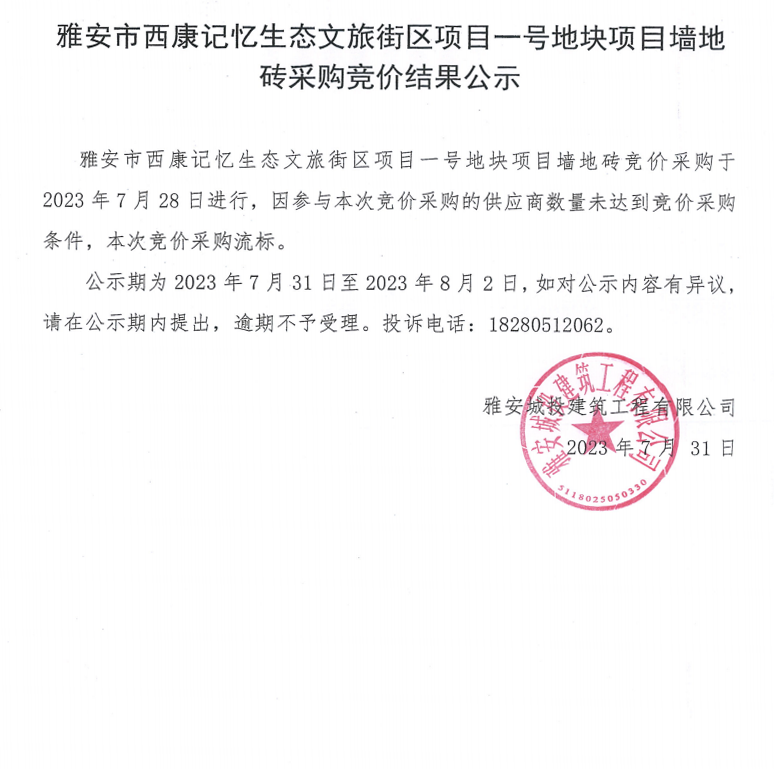 雅安市西康記憶生態(tài)文旅街區(qū)項(xiàng)目一號(hào)地塊項(xiàng)目墻地磚采購(gòu)競(jìng)價(jià)結(jié)果公示
