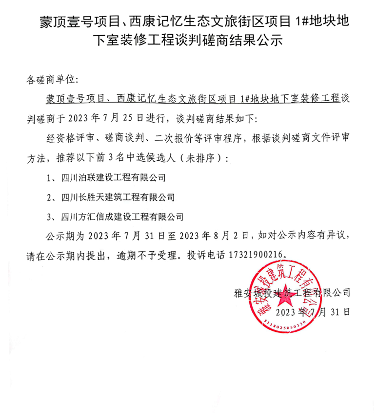 蒙頂壹號項目、西康記憶生態(tài)文旅街區(qū)項目1#地塊地下室裝修工程談判磋商結(jié)果公示