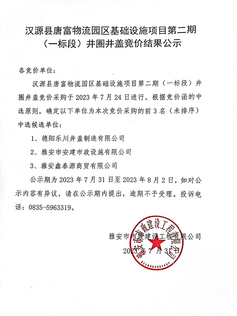 漢源縣唐富物流園區(qū)基礎(chǔ)設(shè)施項(xiàng)目第二期(一標(biāo)段)井圈井蓋采購(gòu)競(jìng)價(jià)結(jié)果公示