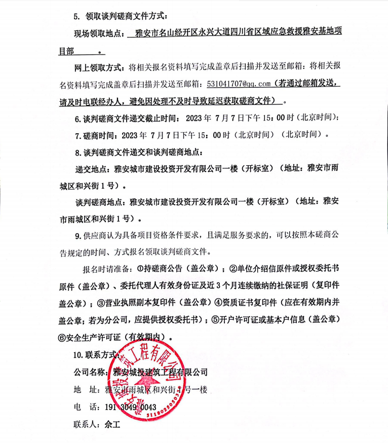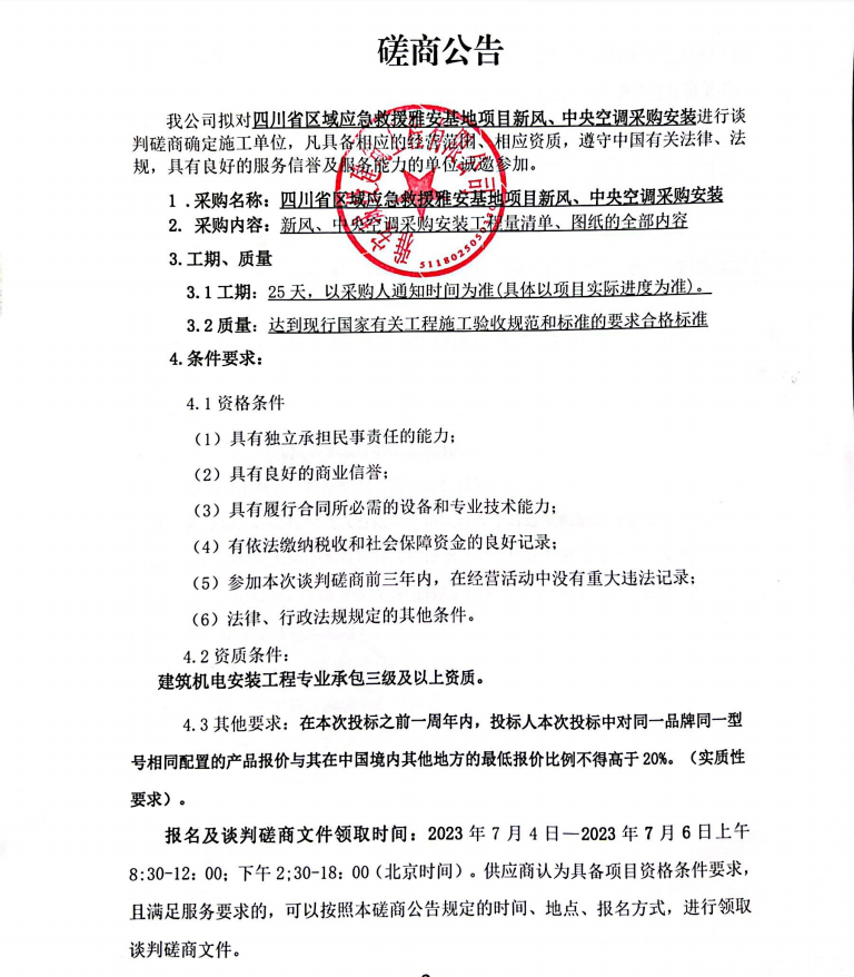 四川省區(qū)域應(yīng)急救援雅安基地項目新風(fēng)、中央空調(diào)采購安裝談判磋商公告