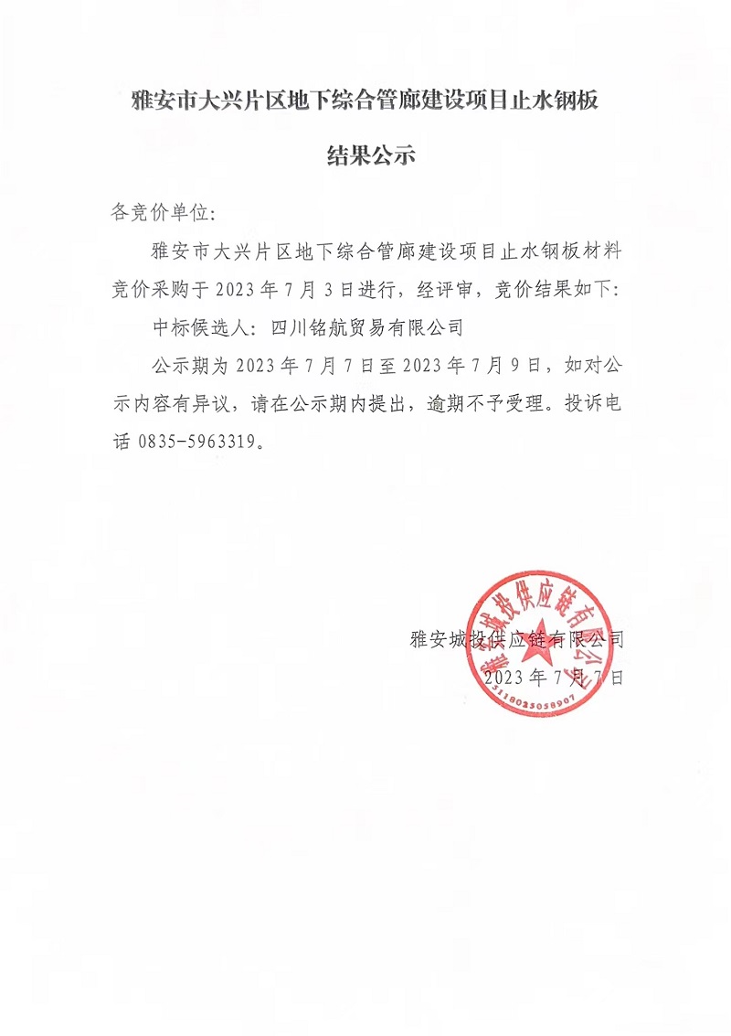 雅安市大興片區(qū)地下綜合管廊建設(shè)項目止水鋼板結(jié)果公示