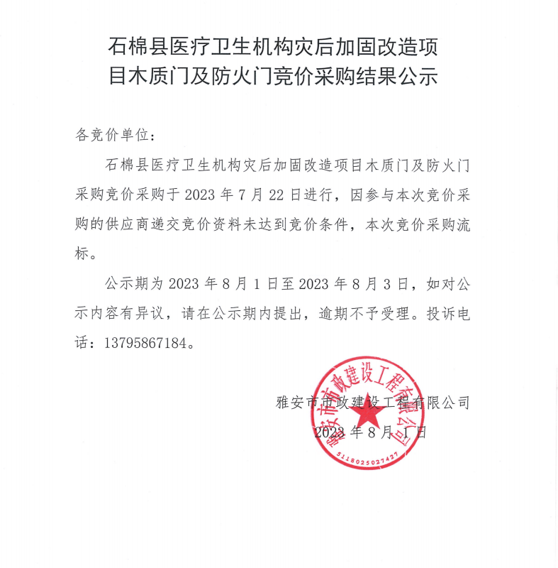石棉縣醫(yī)療衛(wèi)生機構(gòu)災(zāi)后加固改造項目木質(zhì)門及防火門競價采購結(jié)果公示
