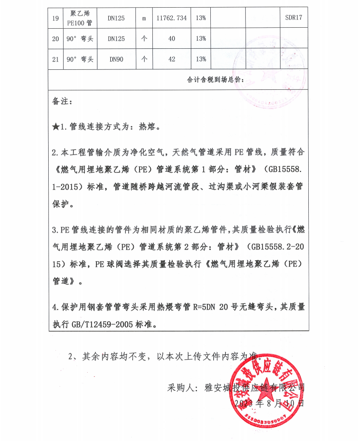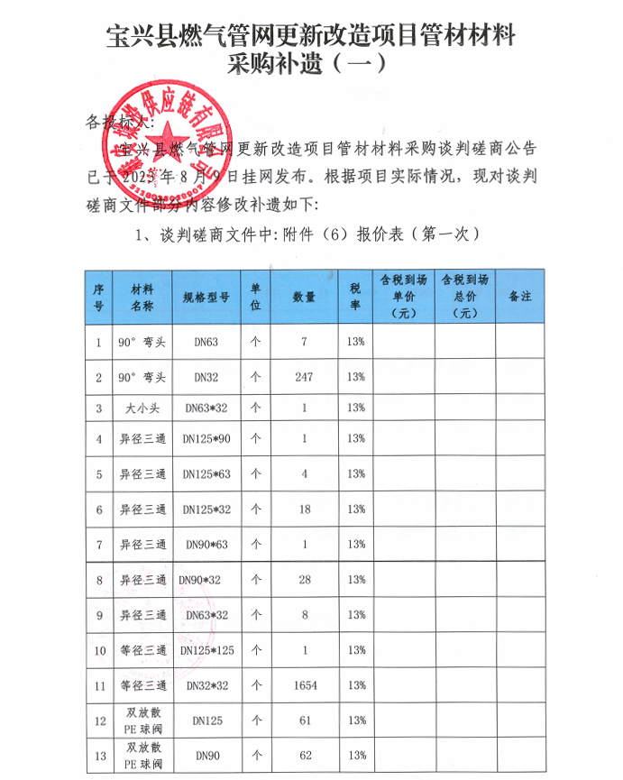 寶興縣燃氣管網(wǎng)更新改造項目管材材料采購補遺(一)