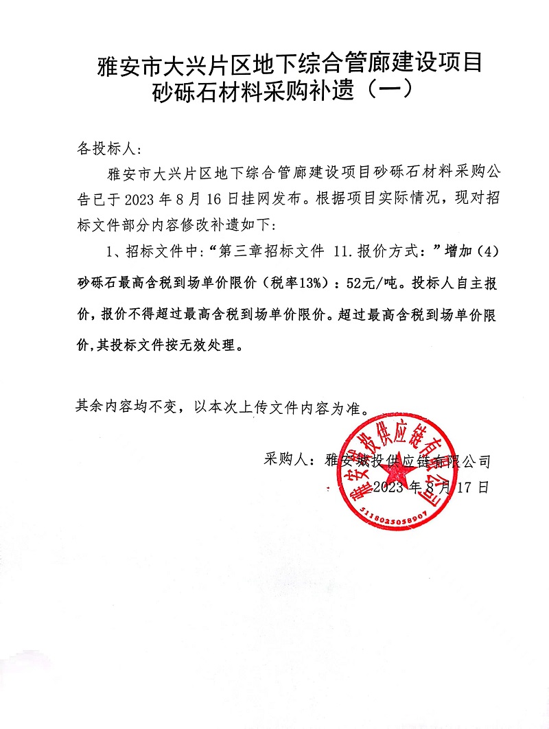 雅安市大興片區(qū)地下綜合管廊建設(shè)項目砂礫石材料采購補(bǔ)遺(一)