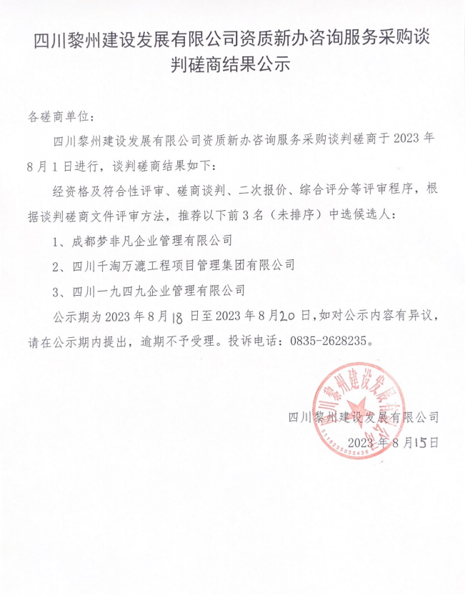 四川黎州建設(shè)發(fā)展有限公司資質(zhì)新辦咨詢服務(wù)采購談判磋商結(jié)果公示