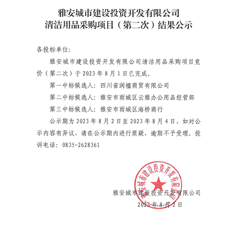 雅安城市建設(shè)投資開(kāi)發(fā)有限公司清潔用品采購(gòu)項(xiàng)目(第二次)結(jié)果公示