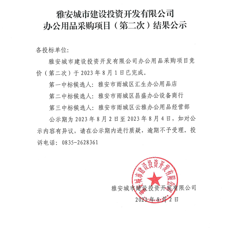雅安城市建設(shè)投資開發(fā)有限公司辦公用品采購(gòu)項(xiàng)目(第二次)結(jié)果公示