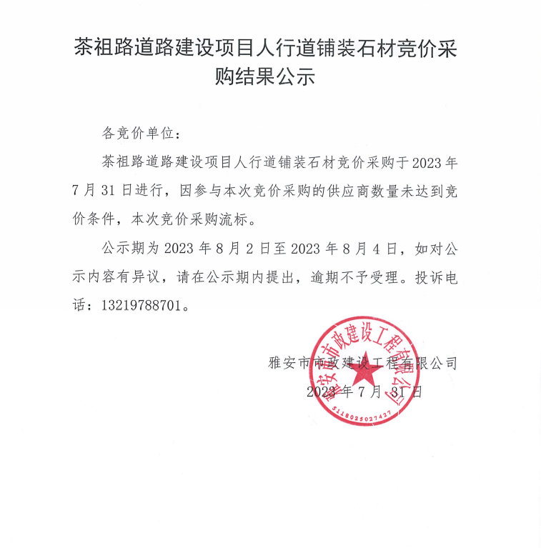 茶祖路道路建設項目人行道鋪裝石材競價采購結果公示