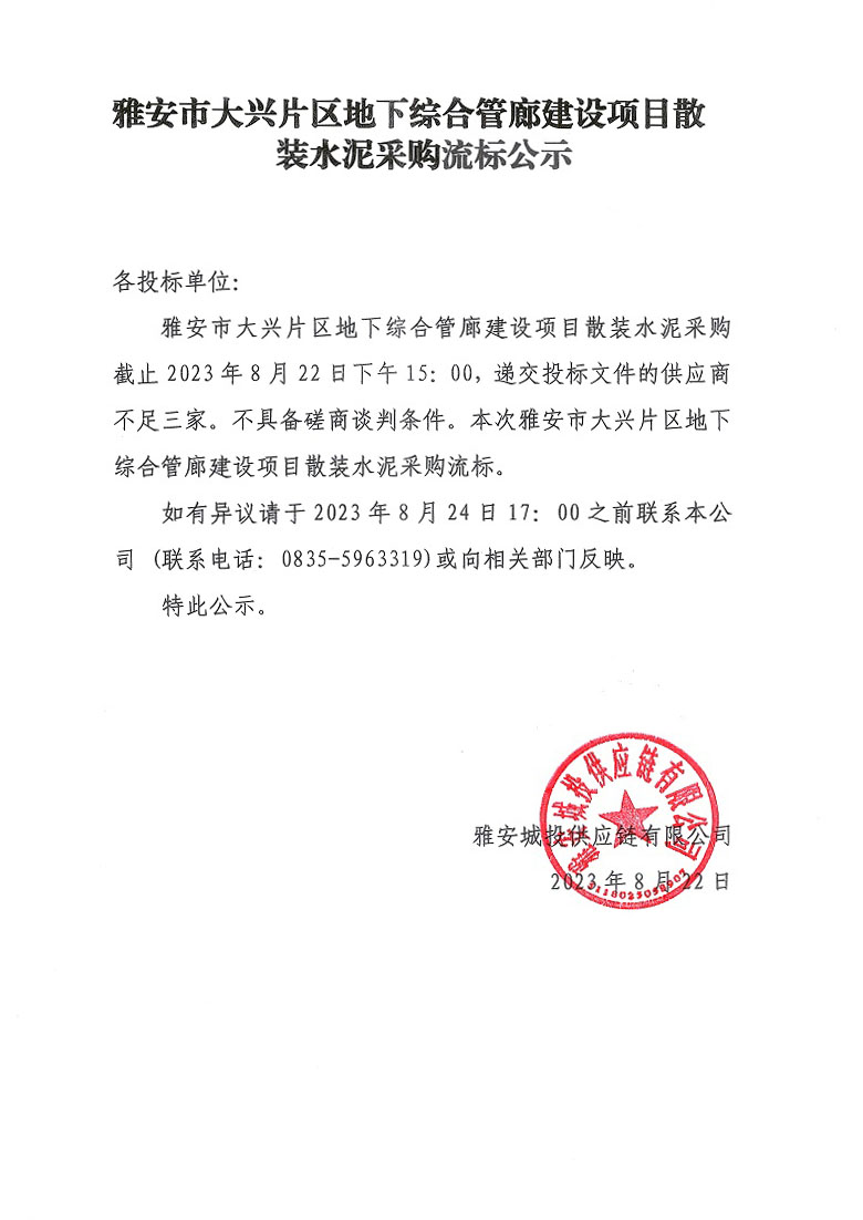 雅安市大興片區(qū)地下綜合管廊建設(shè)項(xiàng)目散裝水泥采購流標(biāo)公示