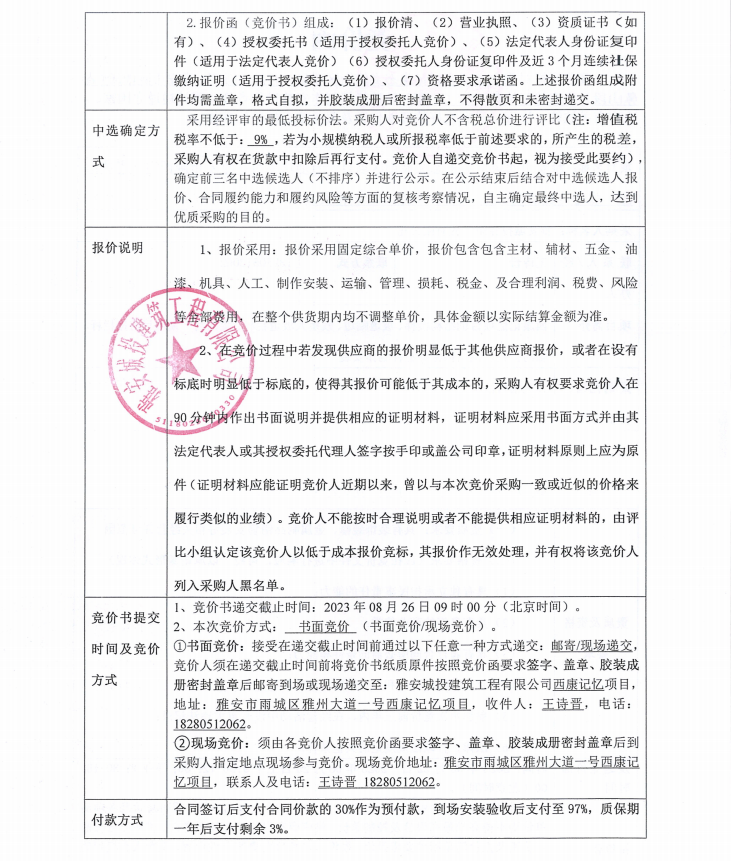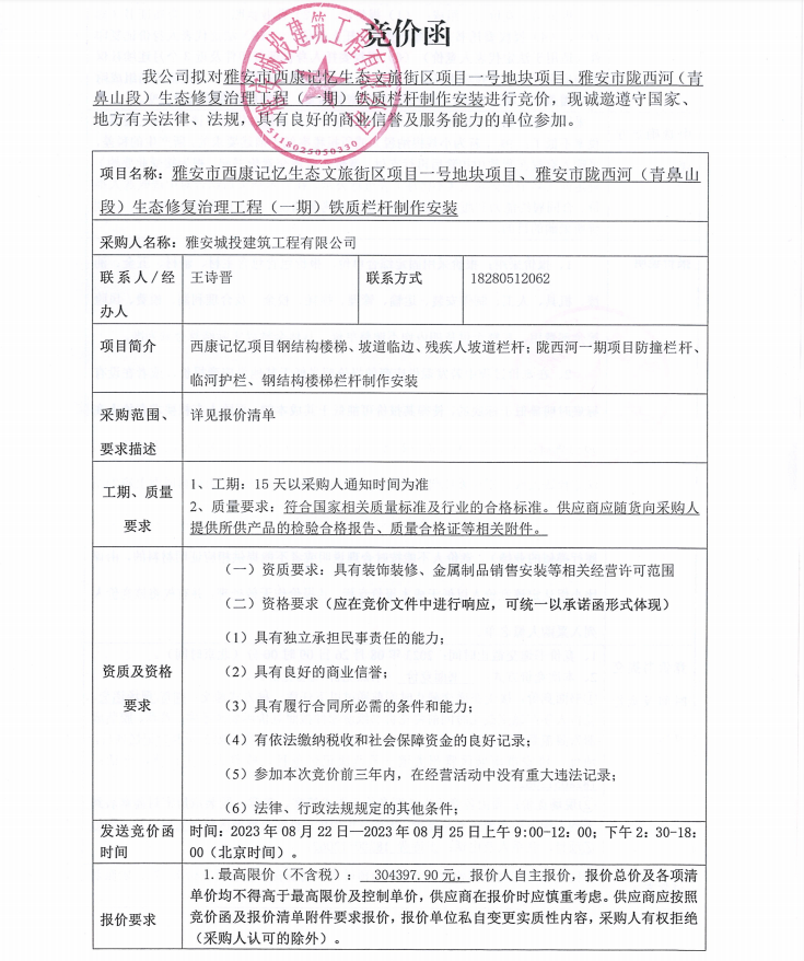 雅安市西康記憶生態(tài)文旅街區(qū)項(xiàng)目一號地塊項(xiàng)目、雅安市隴西河(青鼻山段)生態(tài)修復(fù)治理工程(一期)鐵質(zhì)欄桿制作安裝競價(jià)公告