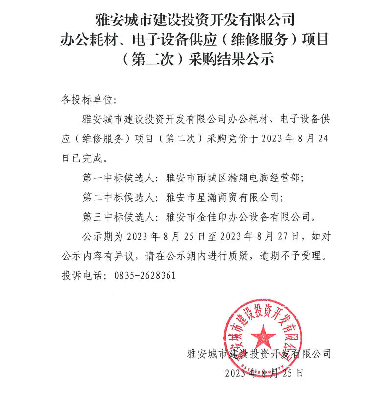 雅安城市建設(shè)投資開(kāi)發(fā)有限公司辦公耗材、電子設(shè)備供應(yīng)(維修服務(wù))項(xiàng)目(第二次)采購(gòu)結(jié)果公示