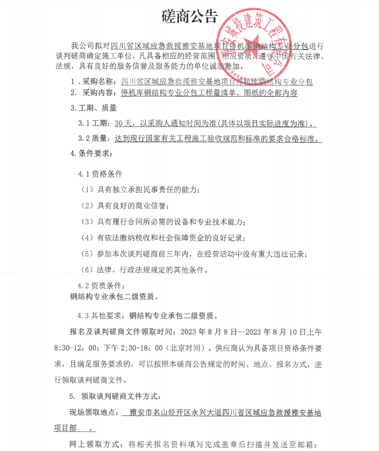 四川省區(qū)域應(yīng)急救援雅安基地項(xiàng)目停機(jī)庫(kù)鋼結(jié)構(gòu)專(zhuān)業(yè)分包談判磋商公告