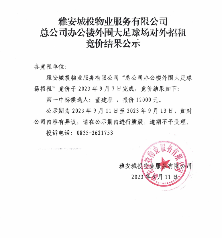雅安城投物業(yè)服務有限公司總公司辦公樓外圍大足球場對外招租競價結果公示