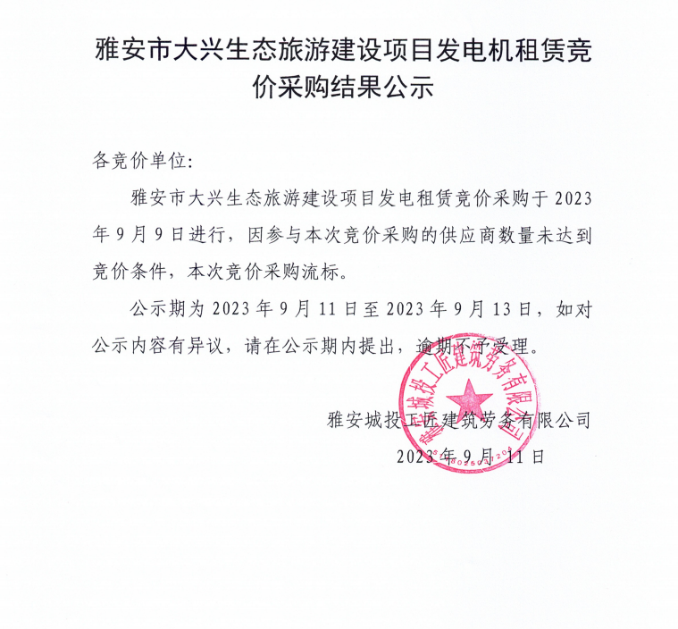 雅安市大興生態(tài)旅游建設(shè)項(xiàng)目發(fā)電機(jī)租賃競(jìng)價(jià)采購結(jié)果公示