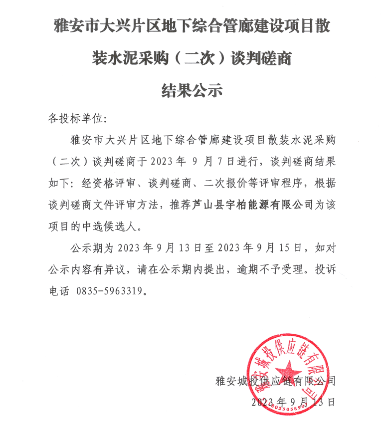 雅安市大興片區(qū)地下綜合管廊建設(shè)項目散裝水泥采購(二次)談判磋商結(jié)果公示