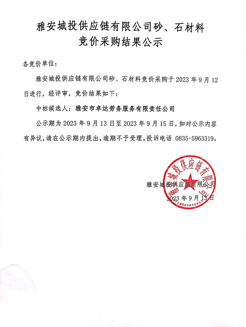 雅安城投供應(yīng)鏈有限公司砂、石材料競價采購結(jié)果公示