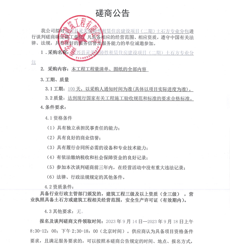 寶興縣靈關(guān)保障性租賃住房建設(shè)項目(二期)土石方專業(yè)分包談判磋商公告