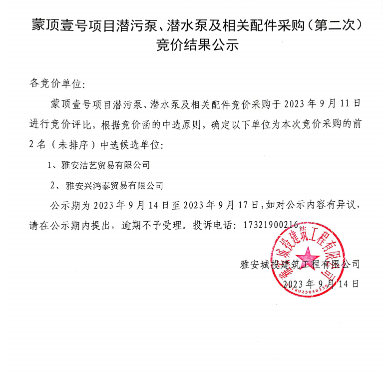 蒙頂壹號(hào)項(xiàng)目潛污泵、潛水泵及相關(guān)配件采購(第二次)競(jìng)價(jià)結(jié)果公示