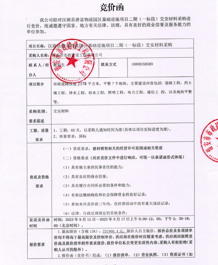 漢源縣唐富物流園區(qū)基礎(chǔ)設(shè)施項目二期(一標段)交安材料采購競價公告