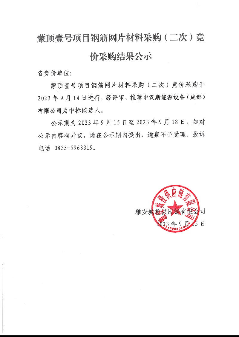 蒙頂壹號項(xiàng)目鋼筋網(wǎng)片材料采購(二次)競價采購結(jié)果公示