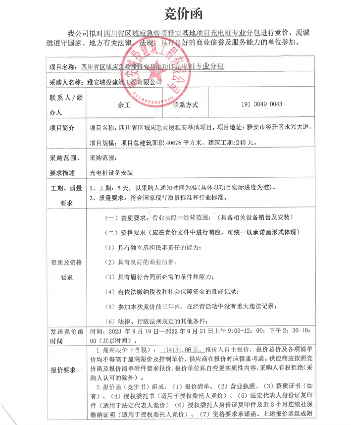 四川省區(qū)域應(yīng)急救援雅安基地項(xiàng)目充電樁專業(yè)分包競(jìng)價(jià)公告