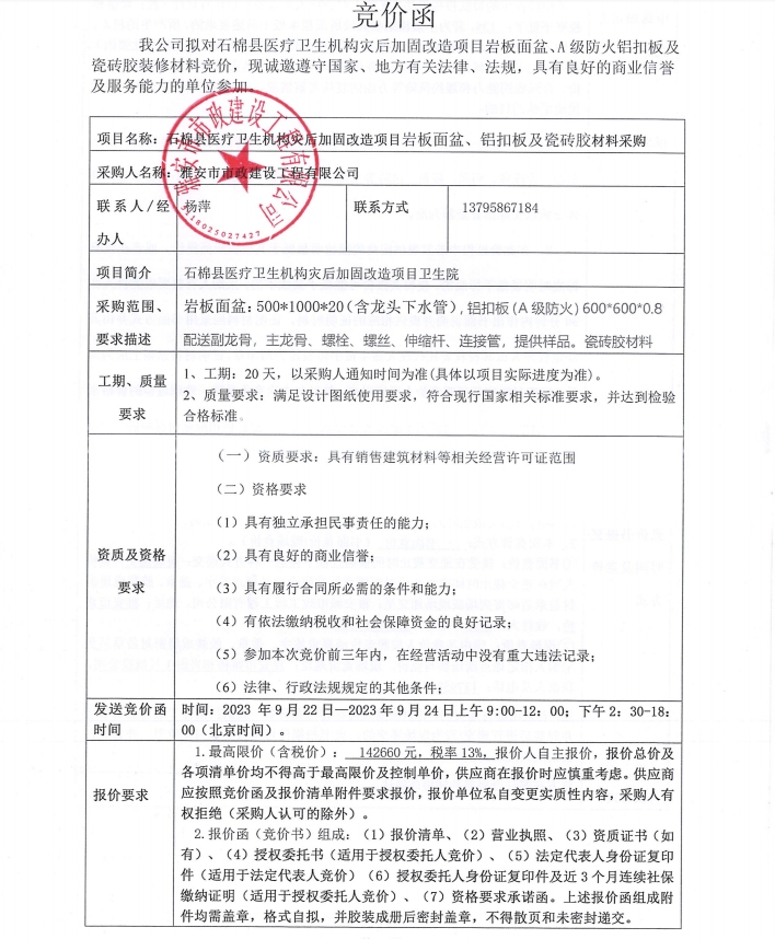 石棉縣醫(yī)療衛(wèi)生機構(gòu)災后加固改造項目巖板面盆、A級防火鋁扣板及瓷磚膠材料采購競價公告