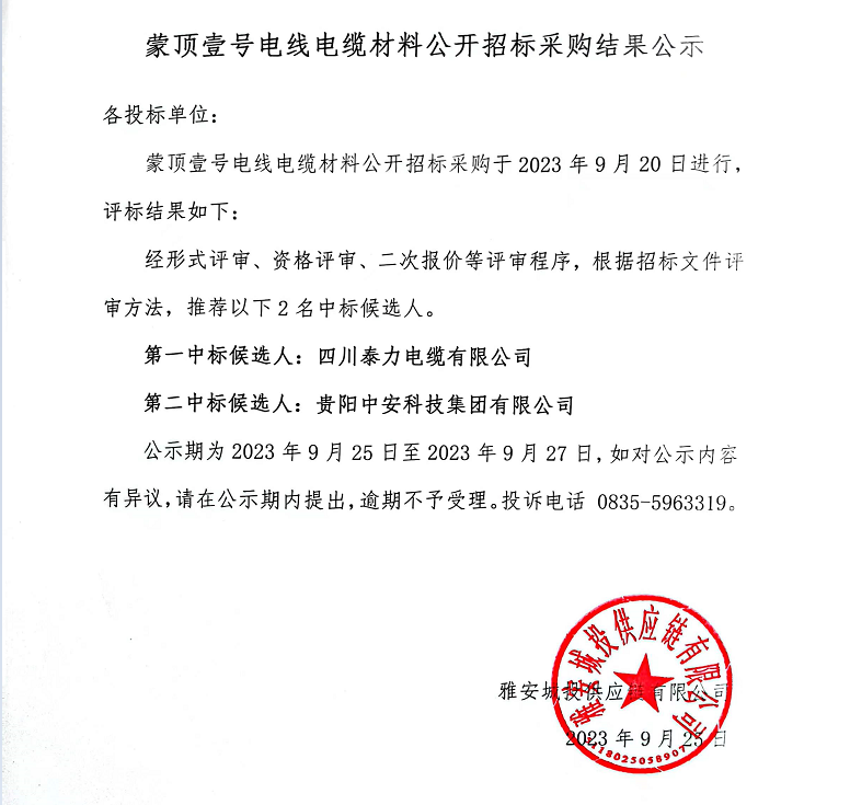 蒙頂壹號電線電纜材料公開招標(biāo)采購結(jié)果公示