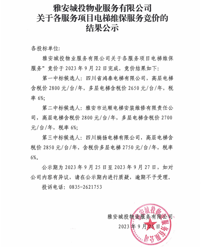 雅安城投物業(yè)服務(wù)有限公司關(guān)于各服務(wù)項目電梯維保服務(wù)競價的結(jié)果公示