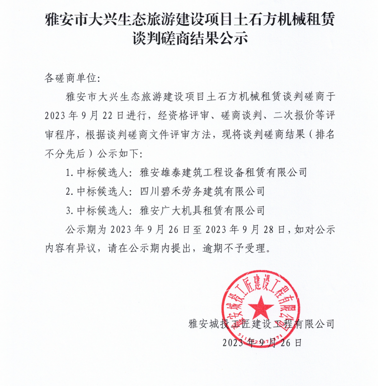雅安市大興生態(tài)旅游建設(shè)項目土石方機械租賃談判磋商結(jié)果公示