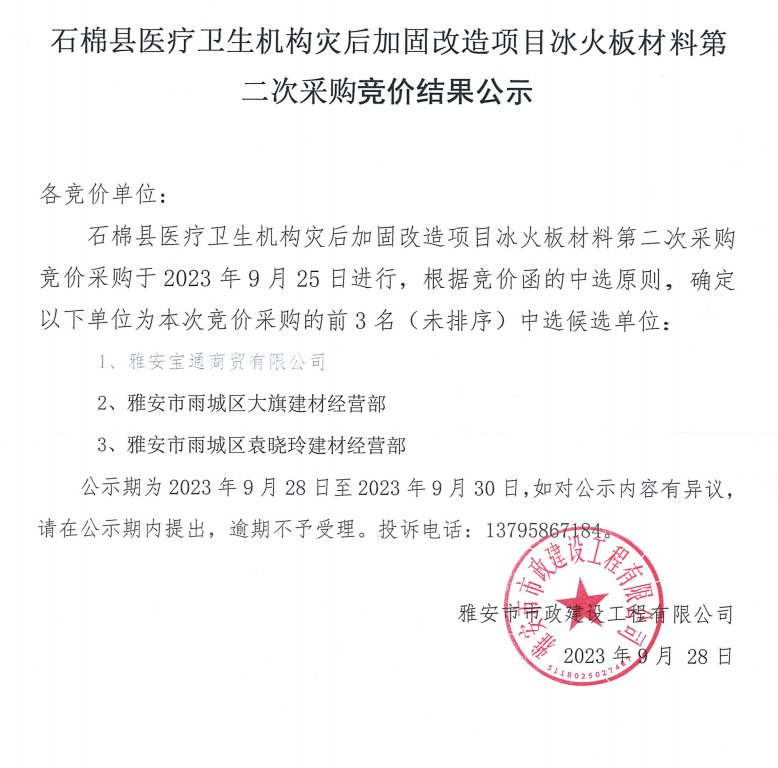 石棉縣醫(yī)療衛(wèi)生機(jī)構(gòu)災(zāi)后加固改造項(xiàng)目冰火板材料第二次采購(gòu)競(jìng)價(jià)結(jié)果公示