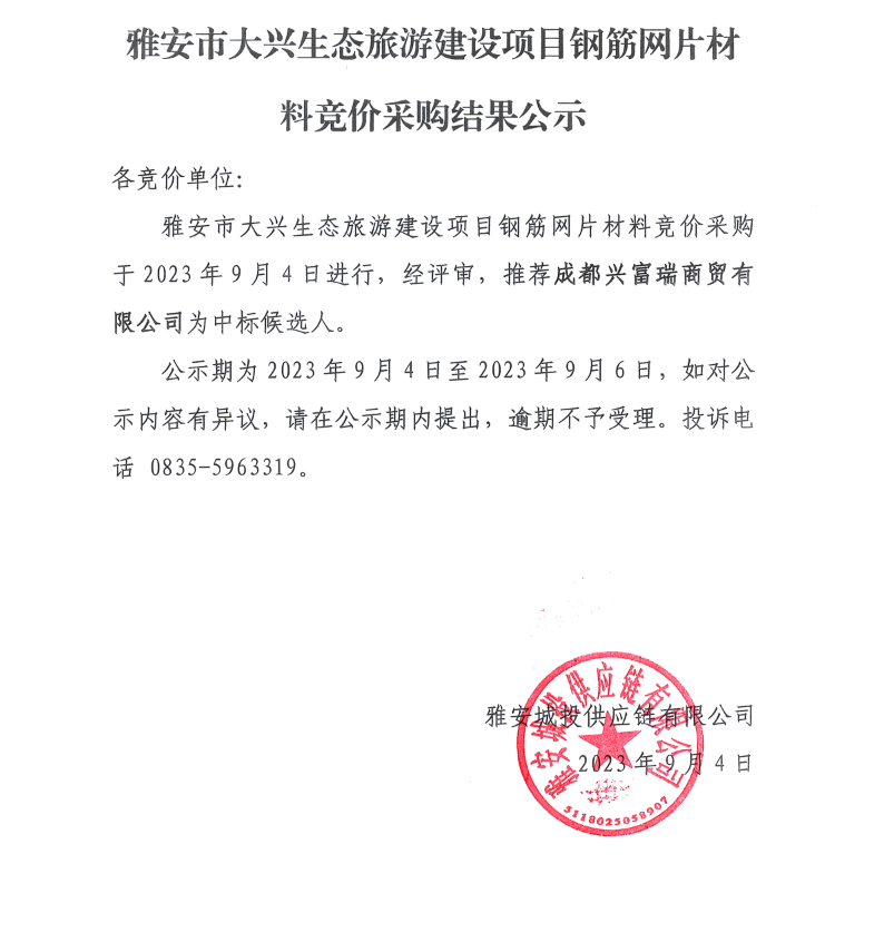 雅安市大興生態(tài)旅游建設(shè)項目鋼筋網(wǎng)片材料競價采購結(jié)果公示