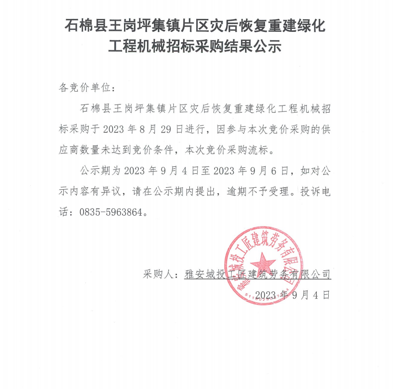 石棉縣王崗坪集鎮(zhèn)片區(qū)災后恢復重建綠化工程機械招標采購結(jié)果公示