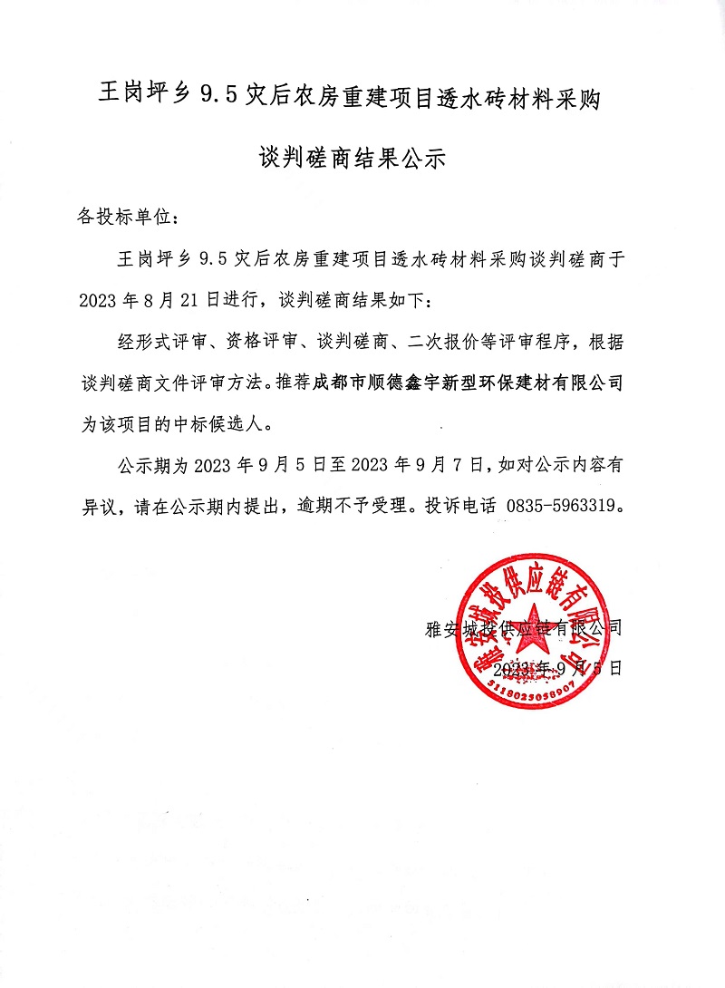 王崗坪鄉(xiāng)9.5災(zāi)后農(nóng)房重建項(xiàng)目透水磚材料采購(gòu)談判磋商結(jié)果公示