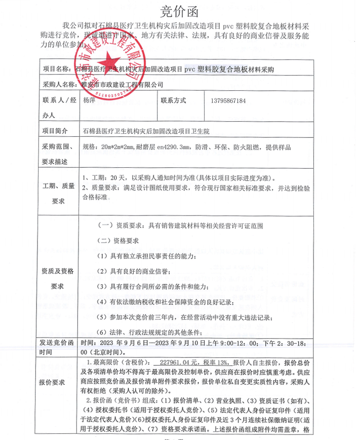石棉縣醫(yī)療衛(wèi)生機(jī)構(gòu)災(zāi)后加固改造項目pvc塑料膠復(fù)合地板采購競價公告
