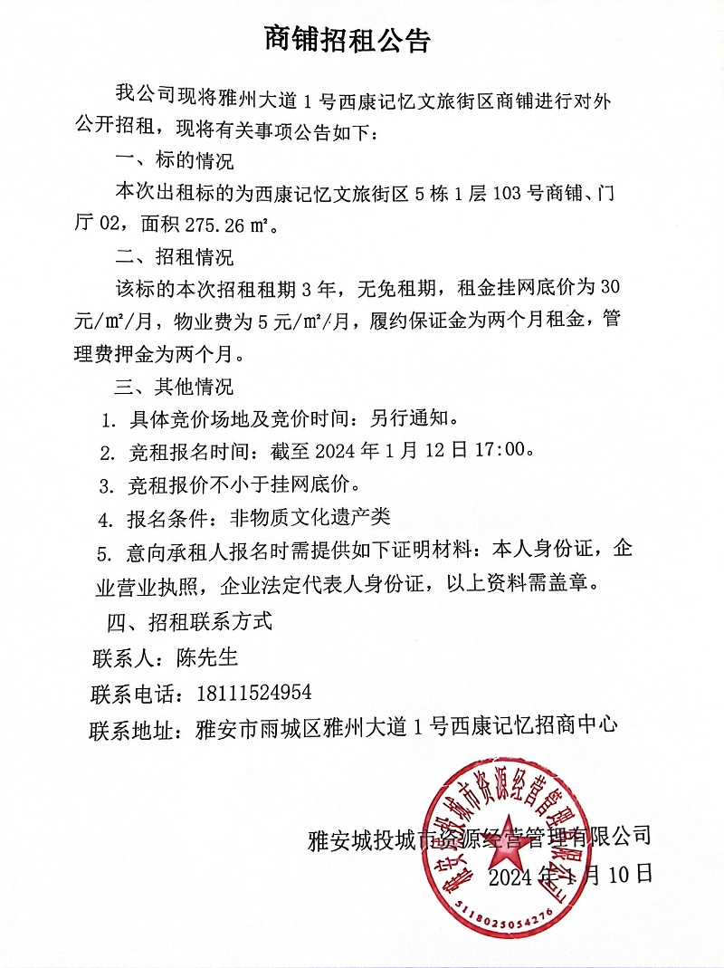 雅州大道1號(hào)西康記憶文旅街區(qū)5棟1層103號(hào)商鋪、門廳02招租公告