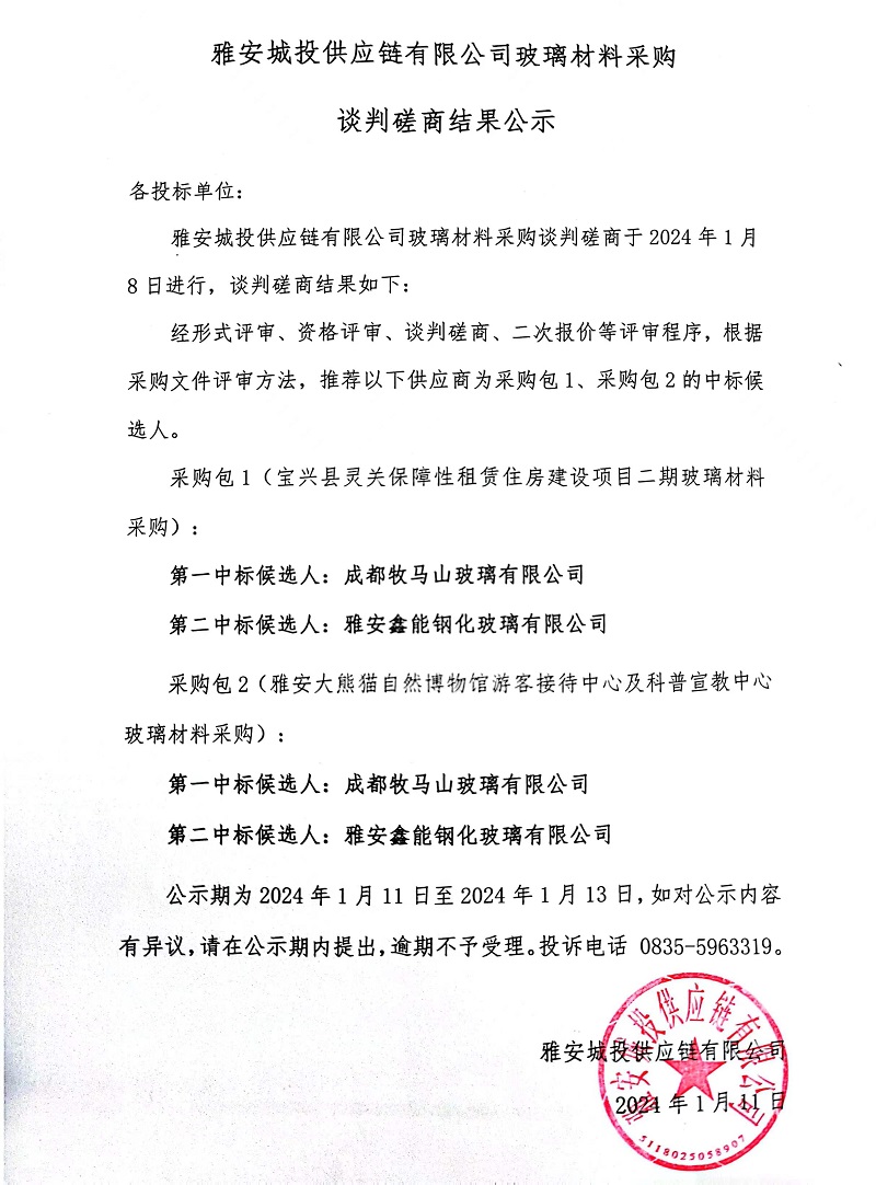雅安城投供應(yīng)鏈有限公司玻璃材料采購談判磋商結(jié)果公示