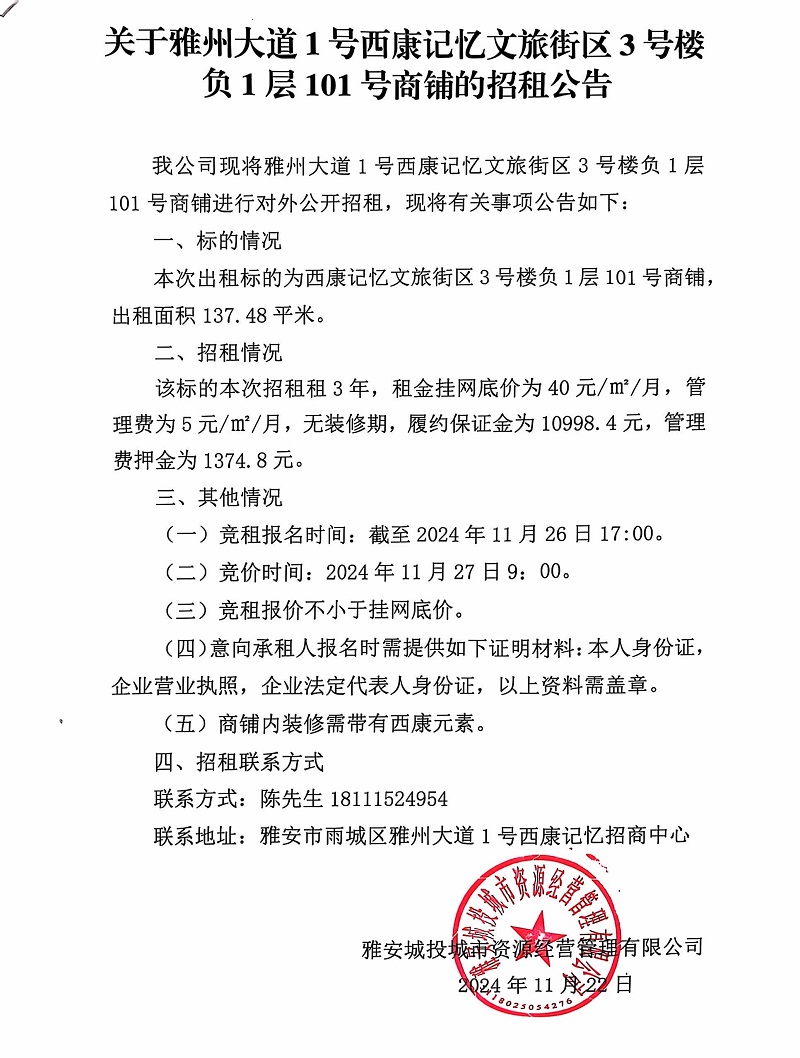 關(guān)于雅州大道1號西康記憶文旅街區(qū)3號樓負1層101號商鋪的招租公告