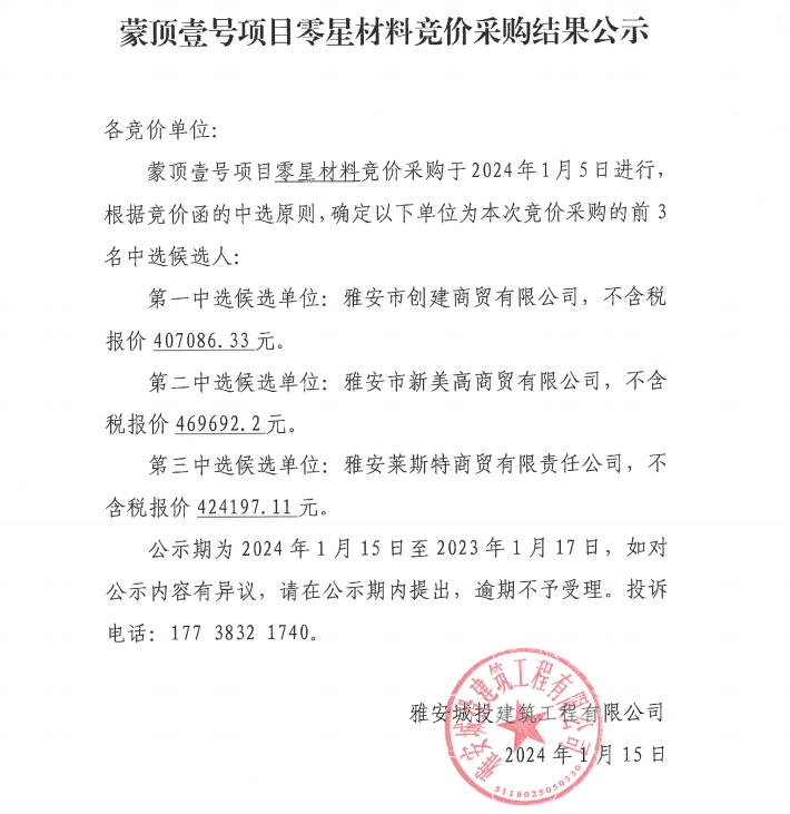 蒙頂壹號(hào)項(xiàng)目零星材料競(jìng)價(jià)采購(gòu)結(jié)果公示