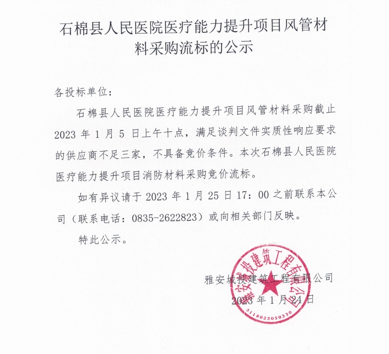 石棉縣人民醫(yī)院醫(yī)療能力提升項目風管材料采購流標的公示